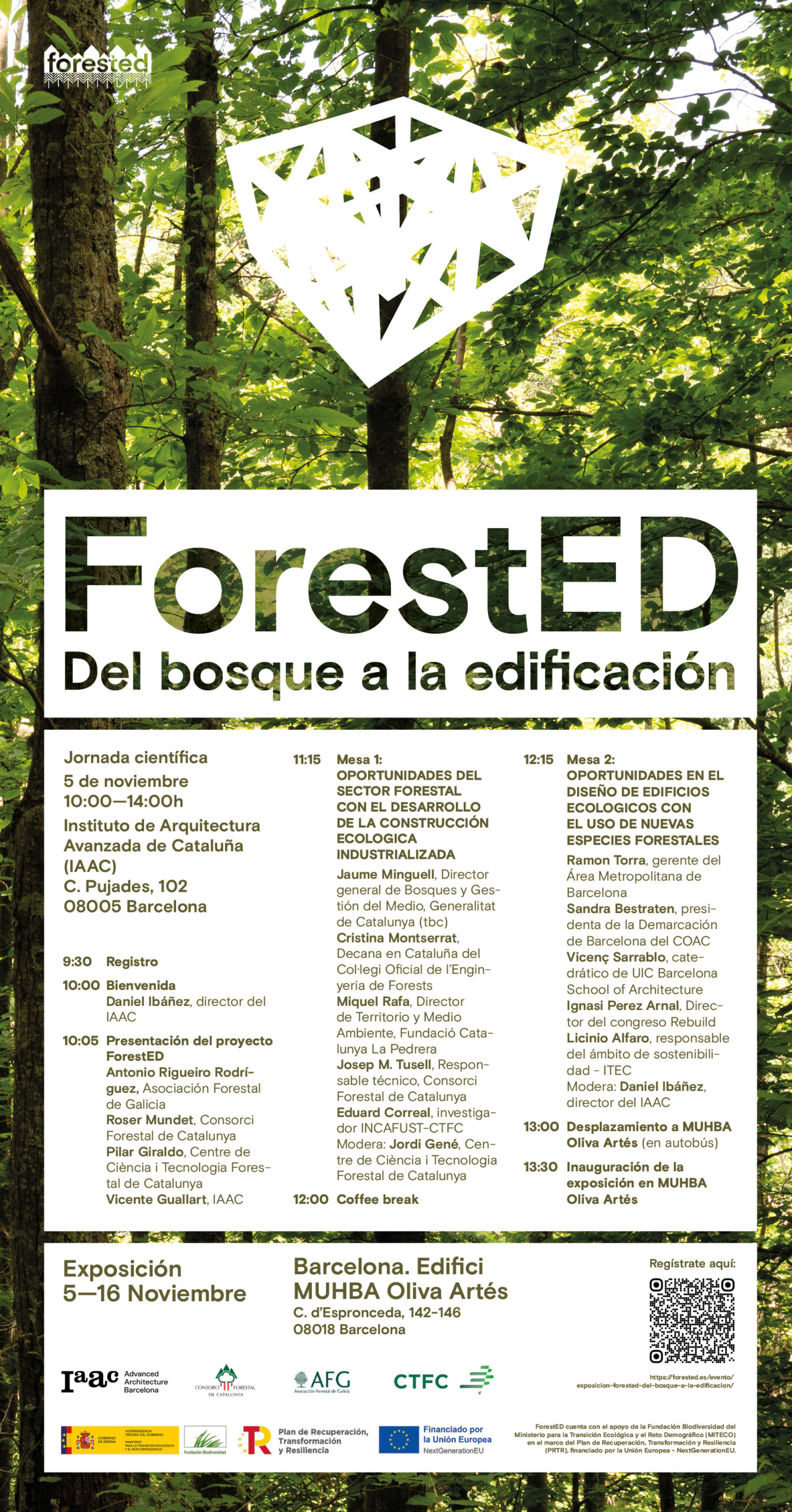 La muestra recorre todo el proceso: desde la caracterización de los bosques y el procesamiento de la madera, hasta la fabricación digital de prototipos y los resultados experimentales obtenidos. También incorpora material audiovisual del documental de ForestED, que recoge el trabajo realizado en los laboratorios y en el territorio.